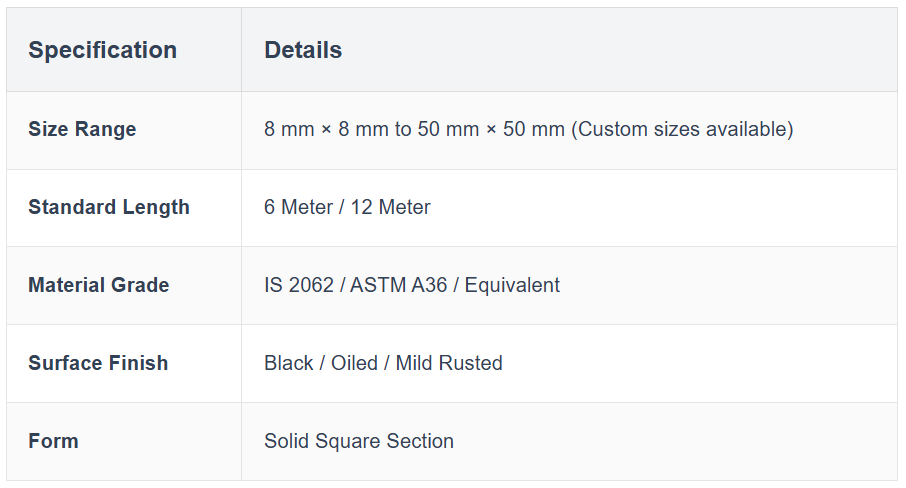 MS Square Bar (Mild Steel Square Bar) is a solid steel product with a square crosssection, widely used in construction, fabrication, and industrial manufacturing. Known for its strength, durability, and uniform shape, MS Square Bar is ideal for load-bearing and precision fabrication work. At M/S. Ma Steel Engineering, we supply high-quality MS Square Bars in various sizes and grades for both wholesale and retail customers.